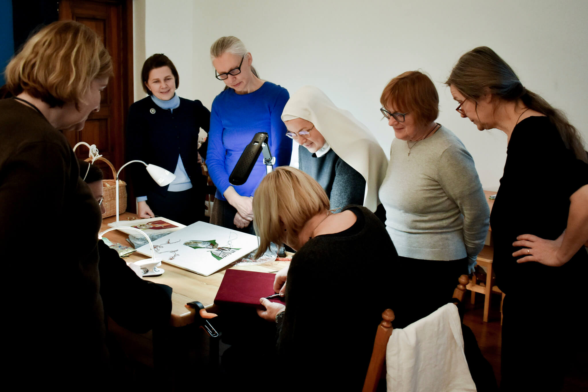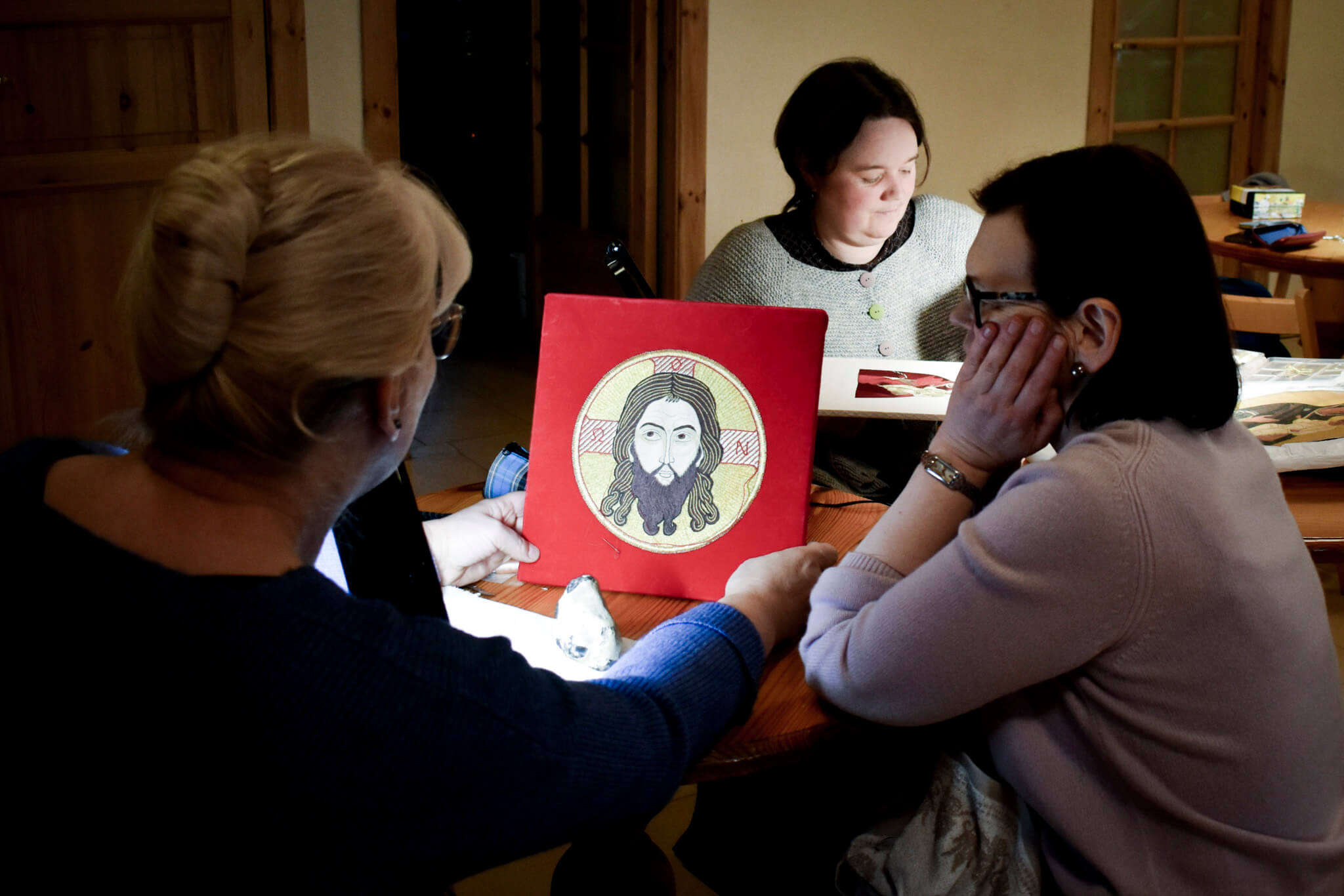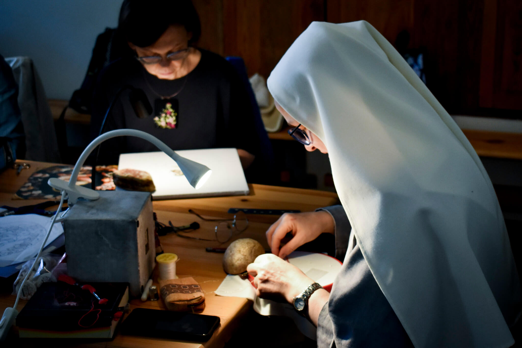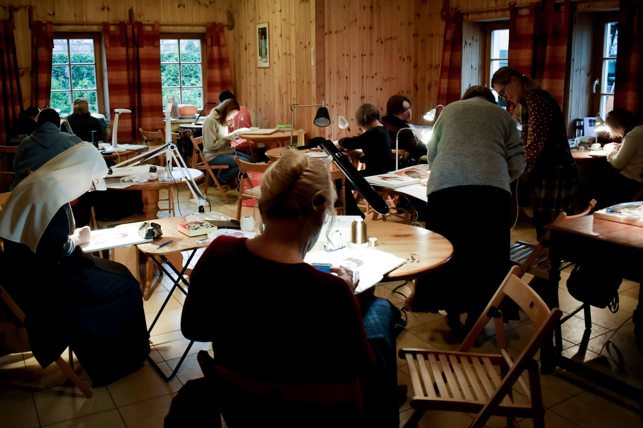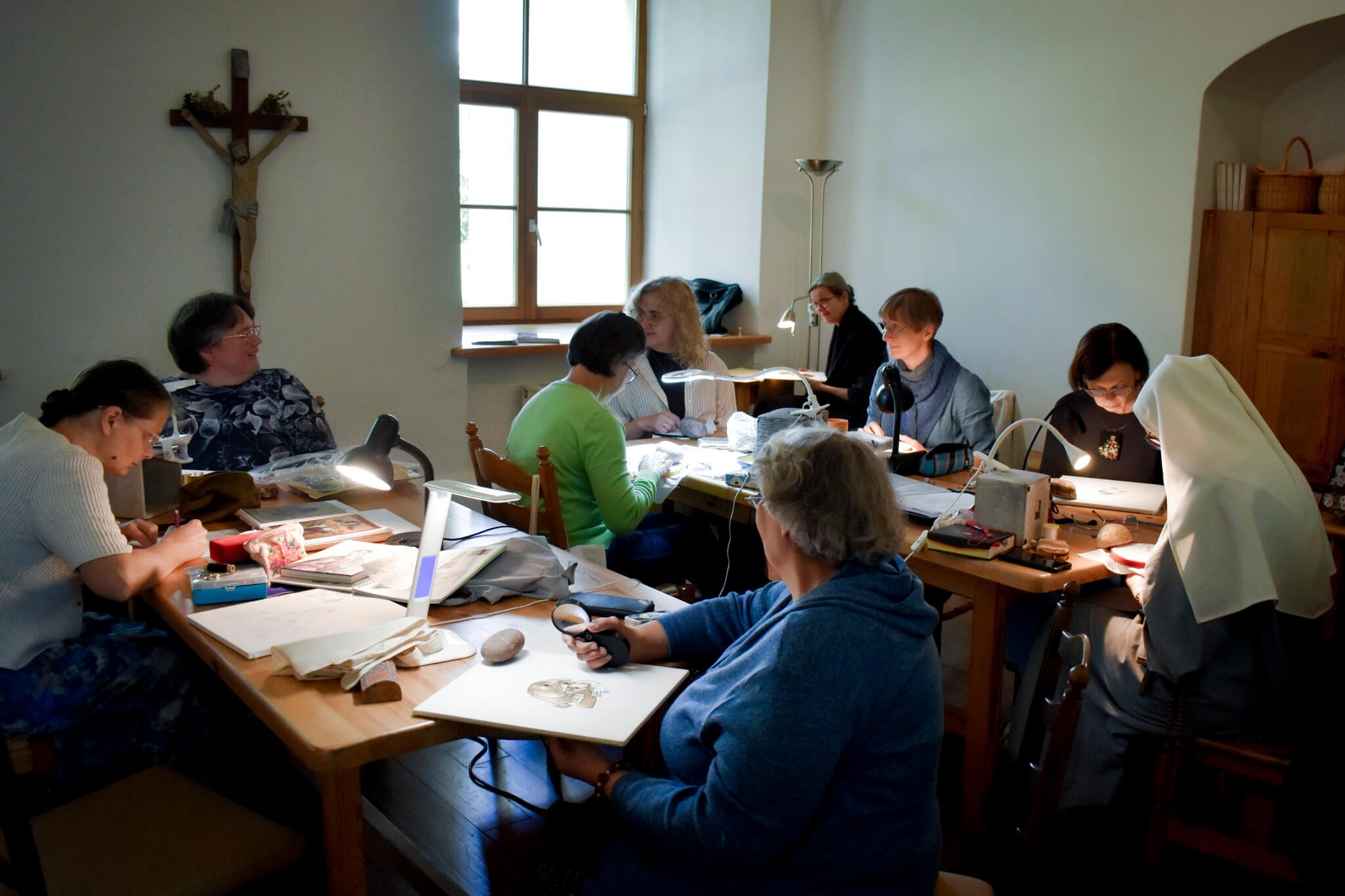 Beveik prieš dešimtmetį susibūrė gražus būrelis vienuolių ir pasauliečių, kurias apjungė noras siuvinėti ikonas. 2017 m. rudenį mūsų vienuolyne įvyko pirmoji 5 dienų trukmės sesija, kurios metu buvo mokomasi ikonų siuvinėjimo meno, o iki 2019 m. – dar 3. Šias sesijas vedė Olga Djačkova – skaitė paskaitas apie siuvinėtų ikonų tradicijas, dalinosi aktualijomis. Jų pabaigoje būdavo surengiamos darbų parodos. Vėliau siuvinėtojos tęsė darbą savarankiškai namuose ir kas mėnesį vieną popietę skirdavo bendram darbui ir bendrystei „Marijos Namuose“.