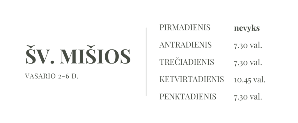 SVARBU! Šv. Mišių laikas gali keistis. Informacija apie su šv. Mišių laiku susijusius pasikeitimus skelbiama šiame įraše ir lentoje prie seserų koplyčios durų.